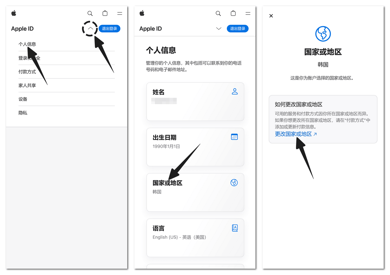 2. 点击菜单栏「个人信息」,然后点击「国家或地区」选项,在出现的新页面中点击「更改国家或地区」。