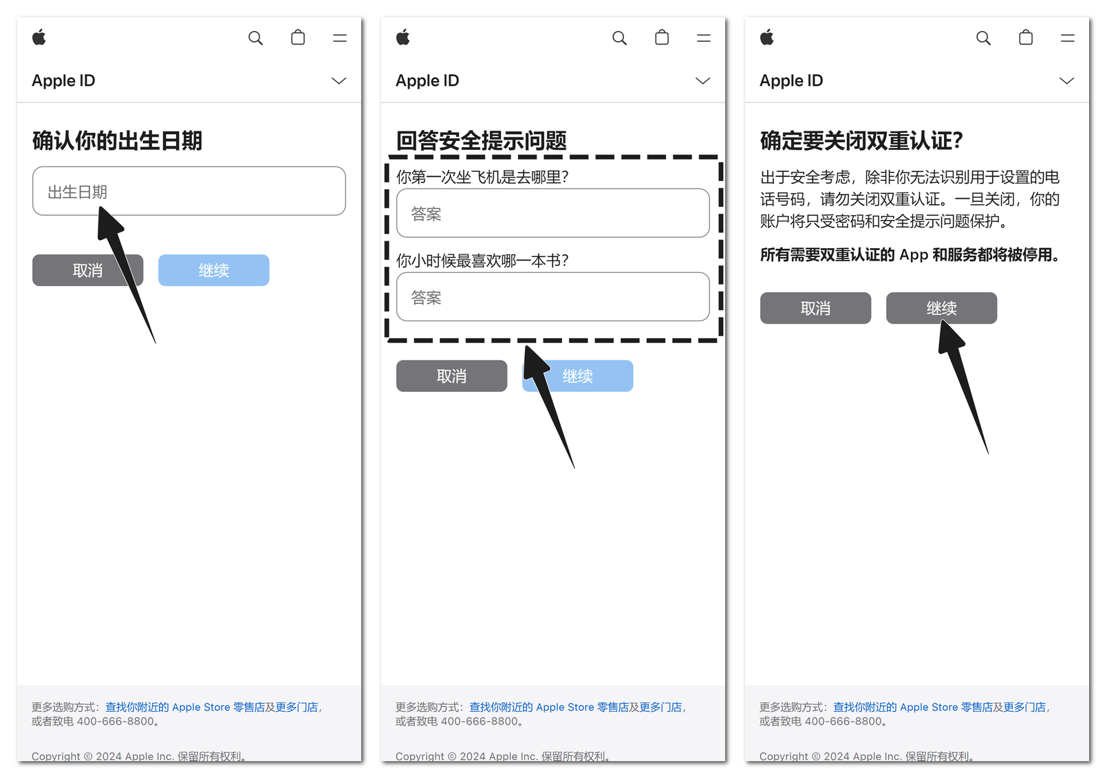 这种方法限制在开启双重认证的 7 天内有效,并且需要知道账号设置的「出生日期」和「安全问题」信息。